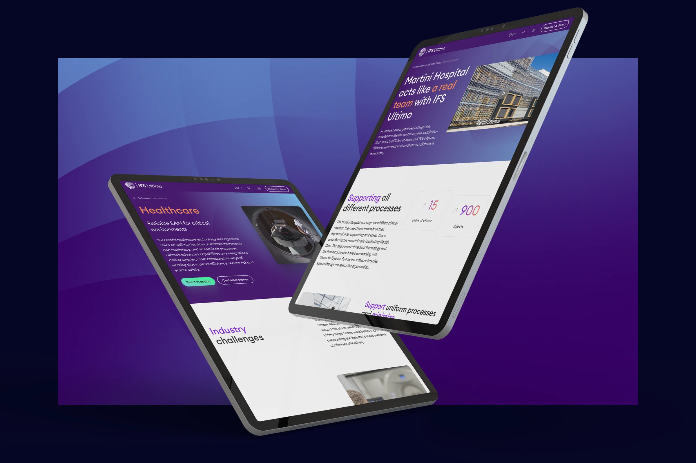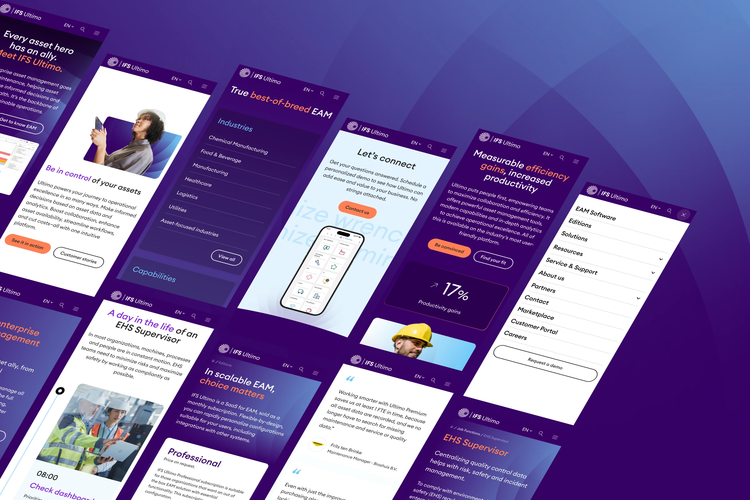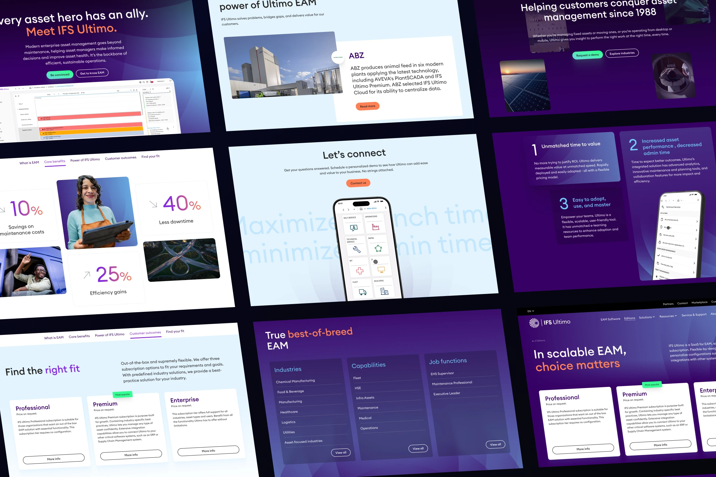 The new IFS Ultimo website was designed to emphasize growth potential and strengthen its global presence, especially in the US and Scandinavia. The strategy combined a bold, data-driven story with a refined visual identity and an entirely new UX. The site blends clarity and interactivity through graphs, infographics, and whitepapers while building emotional connection via testimonials, case studies, and animated visuals—all structured to guide C-level decision-makers and complex DMUs through a smarter sales funnel.